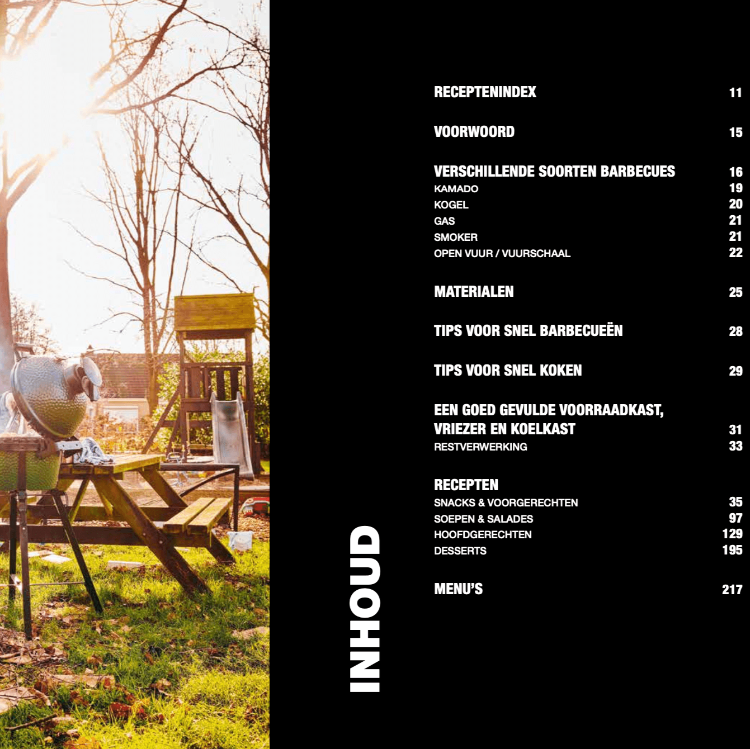 De 85 recepten in dit boek zijn lekker gevarieerd. Ga voor pinwheels van bavette als snack of serveer zalmbonbons met whisky-chilisaus als een lekker voorgerecht. Ideaal voor een feestje, of als onderdeel van een menu. Van gerookte linzensoep tot Aziatische biefstuksalade. Ook hoofdgerechten als quesadilla’s met pulled chicken en shoarma van knolselderij met yoghurtdip staan binnen 30 minuten op tafel. Natuurlijk mogen de zoete desserts als een half-baked brownie niet ontbreken en geeft het boek suggesties voor leuke menu’s. Dit boek leert je verschillende smaken en garnituren te combineren, zodat het voor jou straks geen uitdaging meer is om een snelle en eenvoudige maaltijd van de barbecue te serveren!