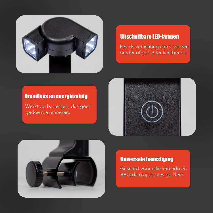 Maak van elke BBQ-sessie een succes met onze Grill Lamp, speciaal ontworpen voor kamado's en barbecues. Of je nu ‘s avonds grillt of in de winter de barbecue aansteekt, deze lamp biedt altijd perfect zicht op je gerechten.