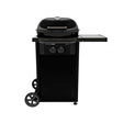 De barbecue bestaat uit een kogel, twee branders, een trechtersysteem, een zijplank en een onderstel met wielen.