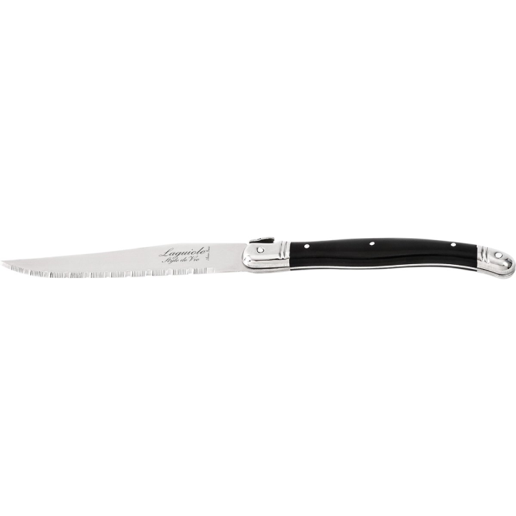 Deze fraaie Laguiole gekartelde steakmessen van Style de Vie snijden makkelijk door vlees of de pizza. Deze messenset met zwart heft wordt geleverd in een stevig messenblok. Dit is veilig en je hebt direct een smaakvolle eyecatcher op het aanrecht. 6 delige zwarte Laguiole steakmessenset met elegante en klassieke uitstraling. Helaas niet geschikt voor de vaatwasser.
