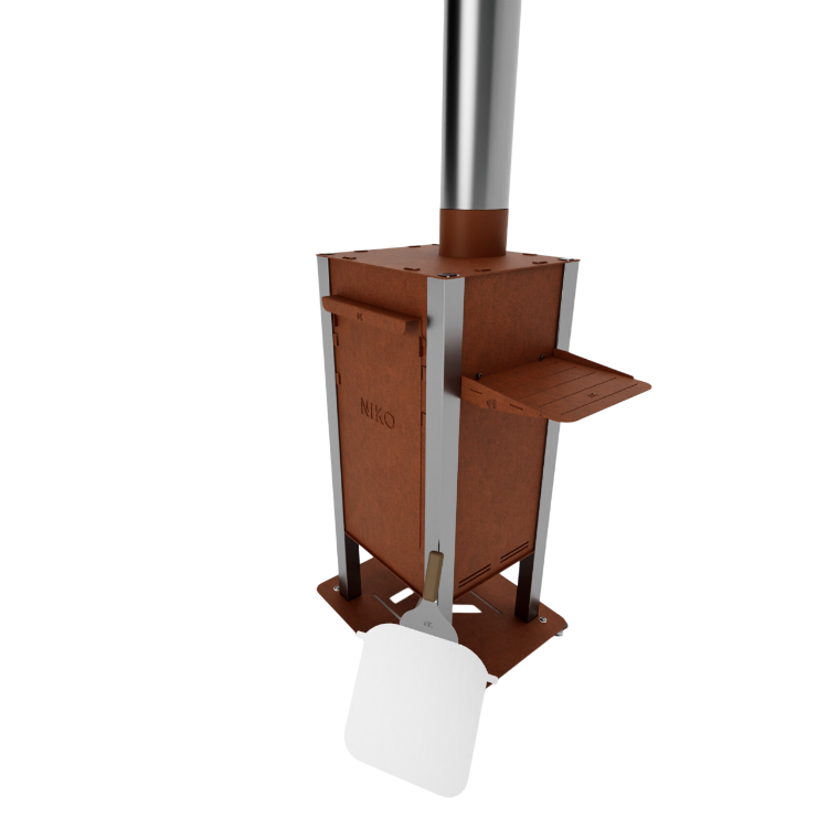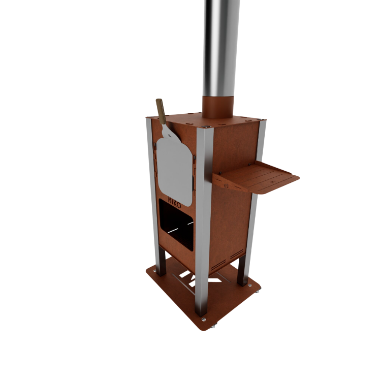 Het is gemaakt van cortenstaal wat langzaam zal roesten. Wanneer de pizza oven geleverd wordt zal deze dus nog een grijze staalkleur hebben, maar na enkele maanden zal die plaats maken voor de sfeervolle bruine roestkleur.
