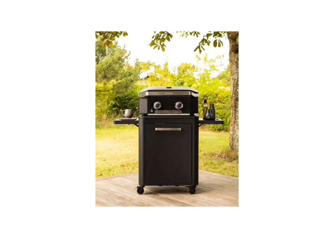 Cozze-Außenküche mit zwei klappbaren Beistelltischen und Gasflaschenhalterung.
