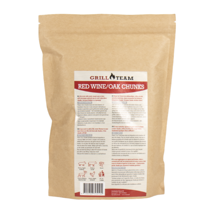 Die aus recycelten Weinfässern hergestellten Rotwein-/Eichenrauchstücke von GrillTeam bieten ein einzigartiges und reichhaltiges Geschmackserlebnis, das Ihre Gerichte auf ein höheres Niveau hebt.