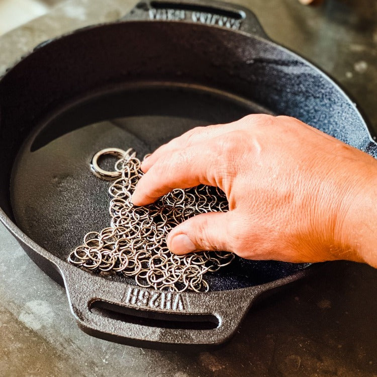Les anneaux tressés en acier inoxydable vous permettent d'éliminer facilement les résidus alimentaires incrustés sans abîmer la patine de votre poêle ni utiliser de liquide vaisselle. Le tapis de nettoyage peut être réutilisé d'innombrables fois et est très facile à nettoyer.