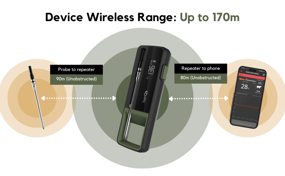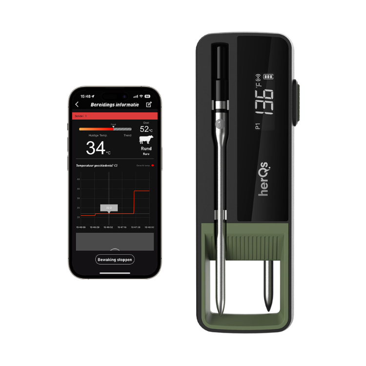 Ontdek de kracht van draadloos koken met dubbele precisie. De herQs Double Max is dé geavanceerde draadloze vleesthermometer met twee slimme probes en een indrukwekkend temperatuurbereik tot maar liefst 500°C.