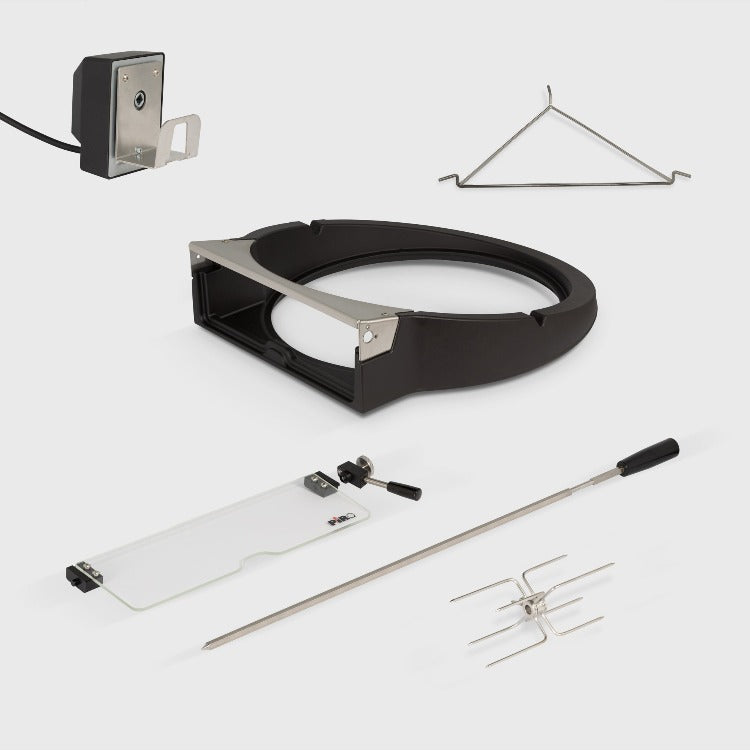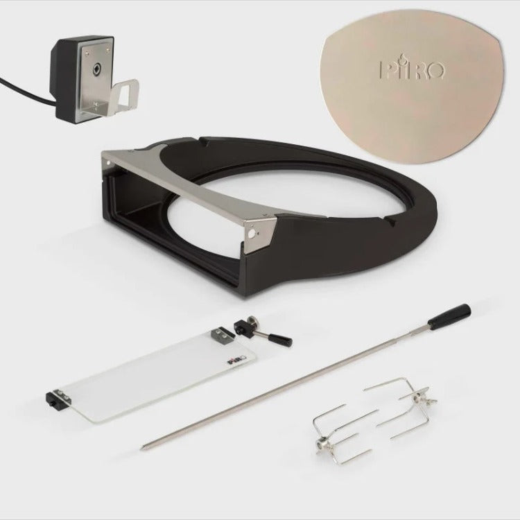 Le PiRO est livré complet avec une pierre à pizza et une broche à rôtir comprenant un moteur de broche, deux fourchettes à broche et des instructions de sécurité et d'utilisation.