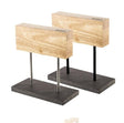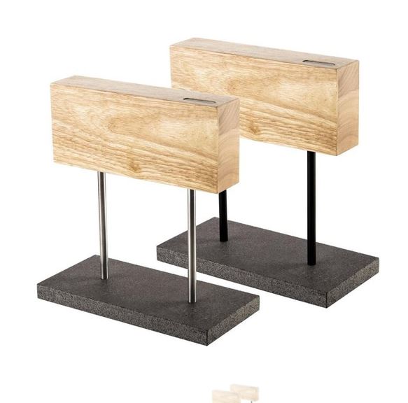 De voet is gemaakt van natuursteen en de magnetische houder is afgewerkt in eikenhout.