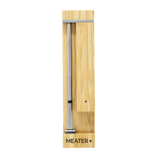 Qua design en functionaliteit is de Meater 2 Plus verpakt in een compacte, houten houder die dient als basisstation en oplader. Met zijn kleine afmetingen (157 x 23 x 37 mm) en magneten aan de achterkant, past het gemakkelijk op het aanrecht, in een lade of aan een koel metalen oppervlak zoals de koelkast.